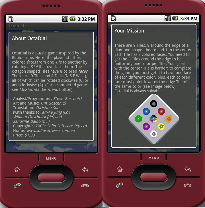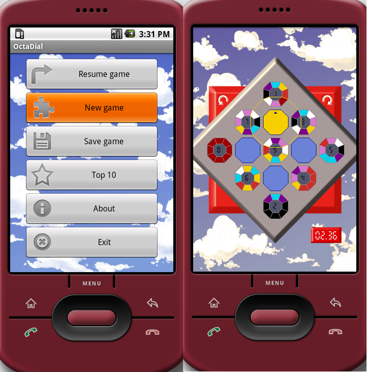 I just couldn't help but see the ADC II (the 2nd Android Developers Challenge) as an opportunity too good to miss! The cut-off for submissions was the end of August just gone. The prize money is good indeed if you can land any part of it - Google is offering nearly $2 million dollars spread across 30 winners (a 1st, 2nd and 3rd across 10 categories). Well, it was early July when I dusted off the C++ code for my puzzle game 'OctaDial' - I originally invented and wrote it as a learning exercise in the C++ language in 1990, and that learning exercise then got so far as to become a commercial game on MS-DOS - but it was only ever marketed in Australia for about 3 years, up until late 1993. It seemed like an appropriate echo in current times, to rebirth OctaDial for the Android in Java, as a serious learning exercise in Android programming that may pay good dividends? It was never worth doing the game in Java on Windows or on Mac OSX, as Java is a second-class citizen on both those operating systems - but the Android system is based on Java itself. Java is first-class on Android - at this point in time its the only language you can use to develop there. Besides that, OctaDial has always been waiting for some small device to come along, something very much like the new generation of Android smart-phones with their good-sized screens, with touch, and a decent pixel resolution.