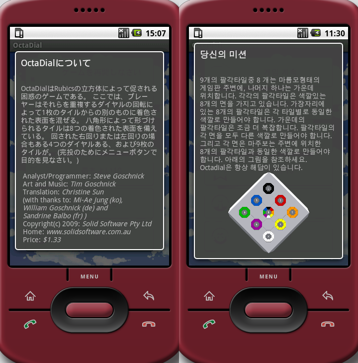 We figured it was important to pick up as many locales as possible for those countries where they currently are or will soon be selling Android-powered phones. Since there is not a lot of language in the game - as you can see in Image1, during game-play itself there is no language at all - it was conceivable to do a handful of languages, even in the hard-pressed time schedule laid down by ADC II. However, as can be seen in Image2 above, there are the menu button labels, plus a paragraph in 'The About' pop-up window and another paragraphs worth in the player's 'Mission' pop-up (see figures below). With some editing by friends, family and associates, Christine managed to include 7 languages, namely: English, Traditional Chinese, Simplified Chinese, Korean, Japanese, German and French (plus some Italian).